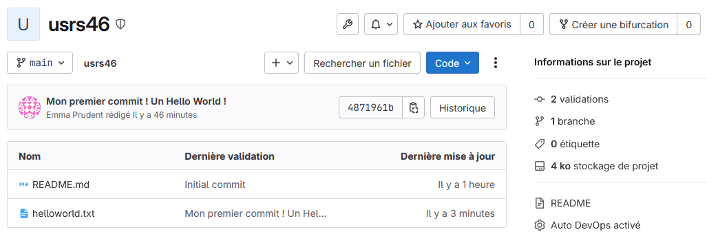 Votre fichier helloworld.txt devrait maintenant être visible sur GitLab.