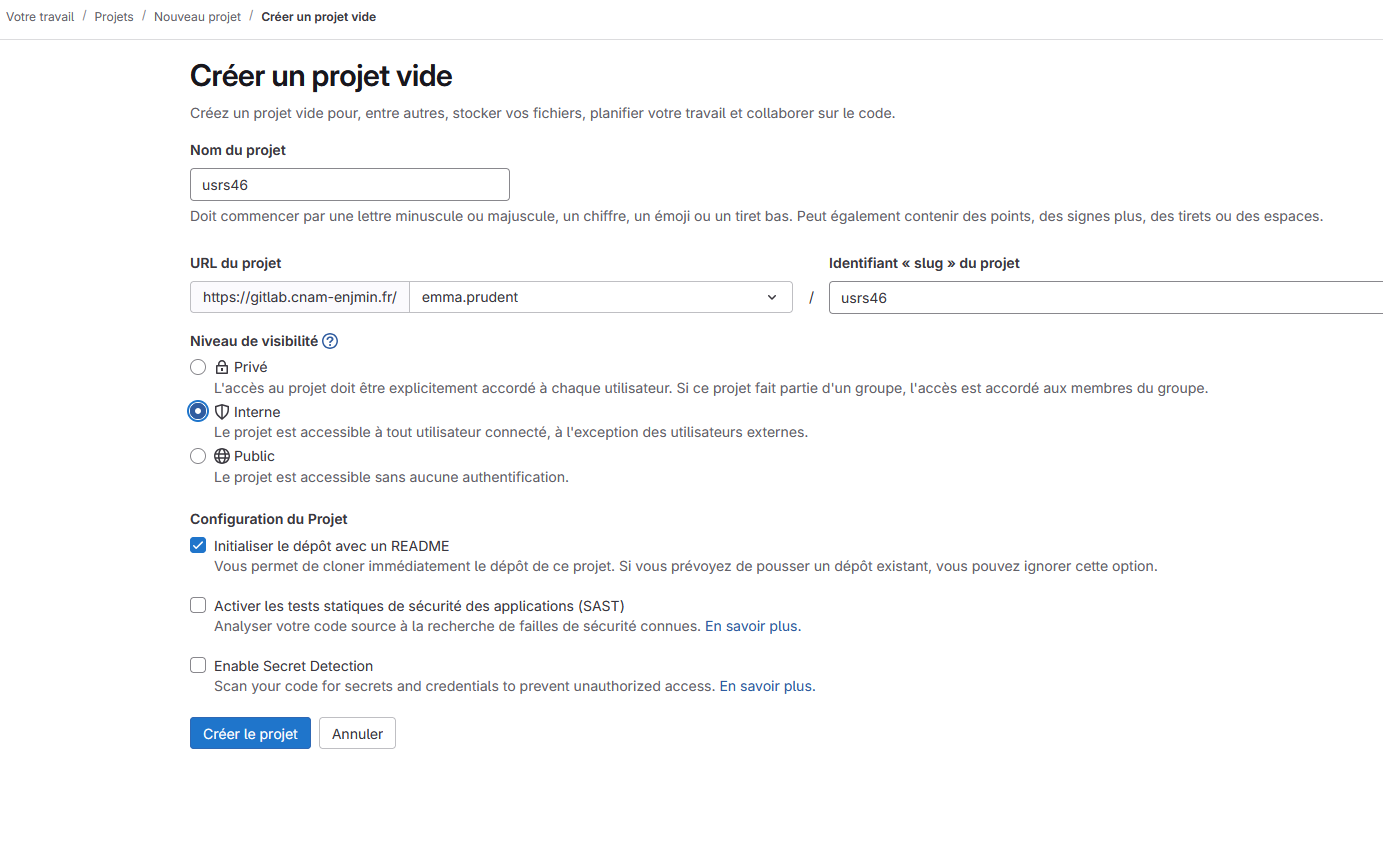 Nous allons maintenant créer un projet et le connecter au GitLab de l'école : https://gitlab.cnam-enjmin.fr/
