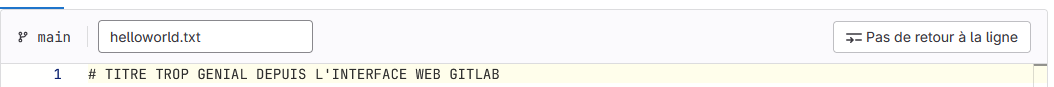 Illustrons l'apparition d'un conflit par un exemple pratique. J'ai un dépôt usrs46 sur le serveur distant GitLab et un clone de ce dépôt sur ma machine en local. Je vais modifier des deux côtés le fichier helloworld.txt pour lui ajouter un titre.
